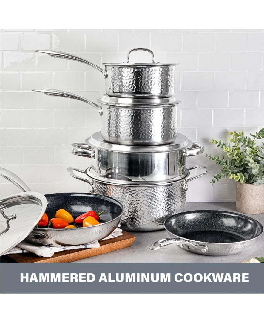 Hammered Stainless Steel Tri-Ply Diamond-Infused Nonstick 10pc. Cookware set, Cr